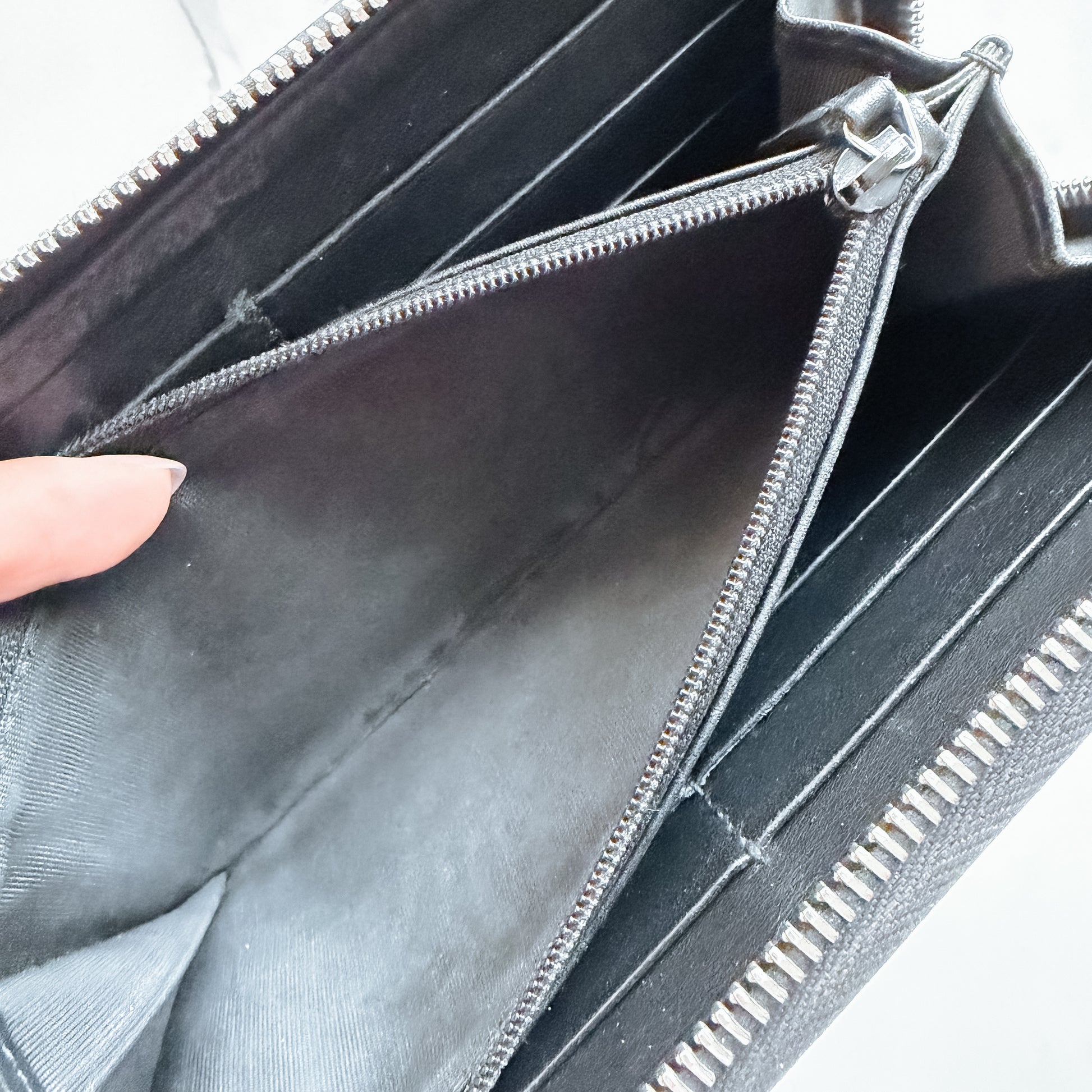 Some visible wear and tarnishing on the logo hardware and zipper pull Clean interior with expected storage odor
