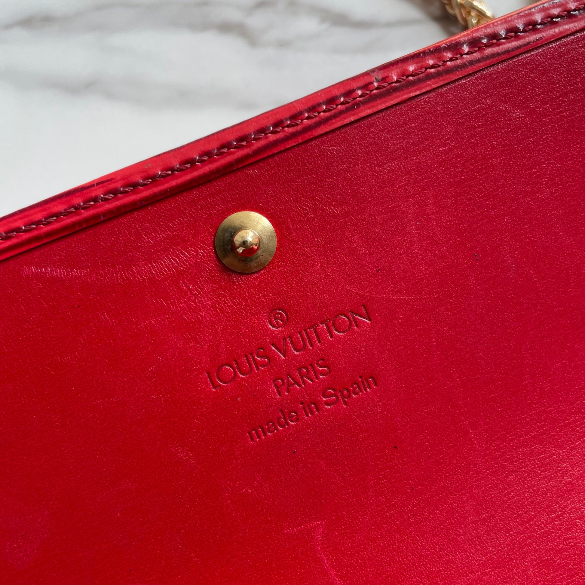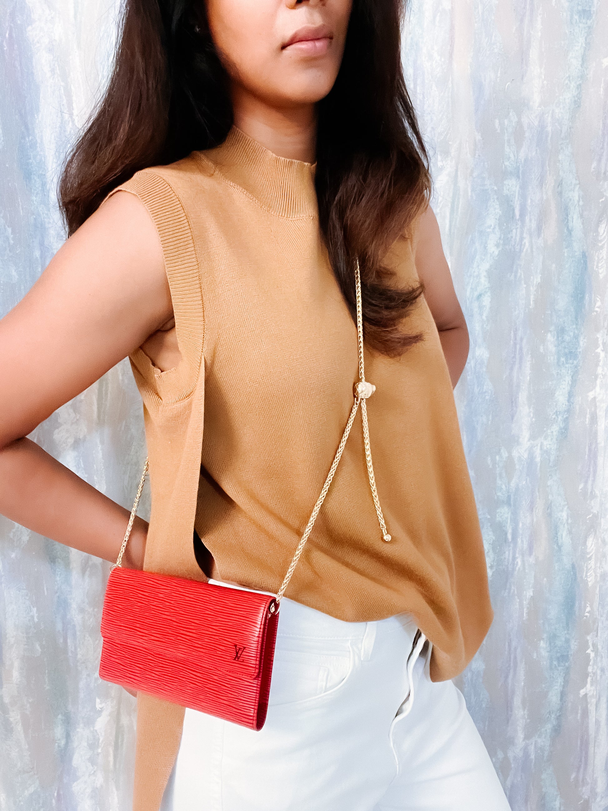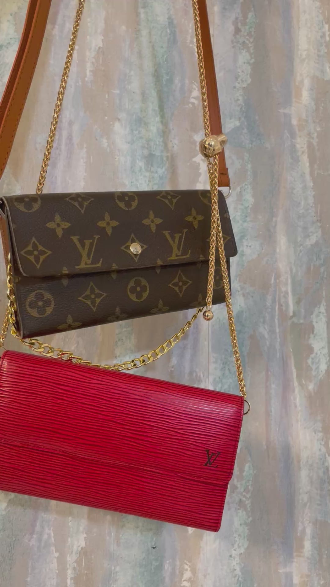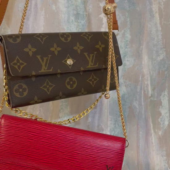 LV wallet converted into a crossbody with an unbranded, adjustable chain and metal grommets. Chain can be easily removed to carry as a wallet.