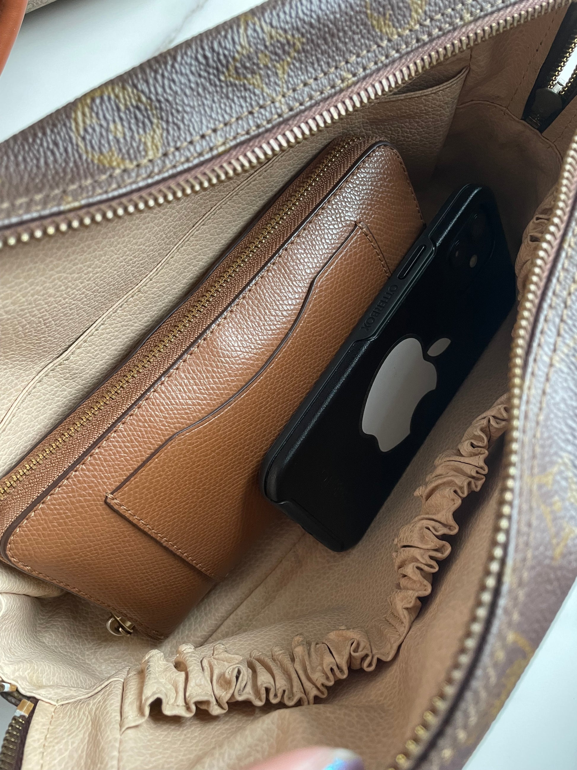 Large spacious interior will easily accommodate a long wallet, phone and so much more.