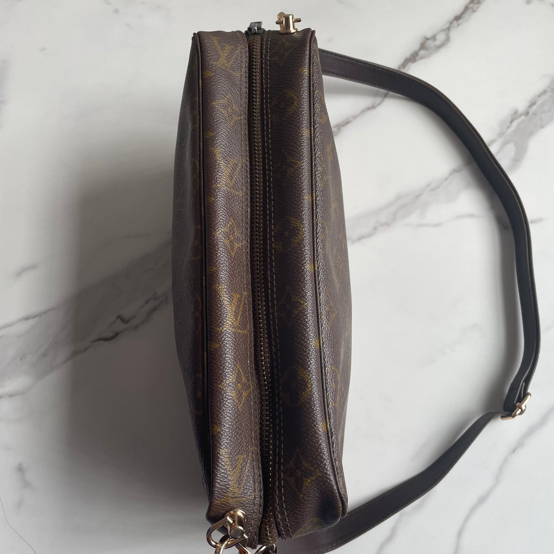 Louis Vuitton signature brown monogram coated canvas with an ivory waterproof pvc interior. The clean interior has a slip pocket and 3 bunched elastic holds. No visible discoloration or stains.