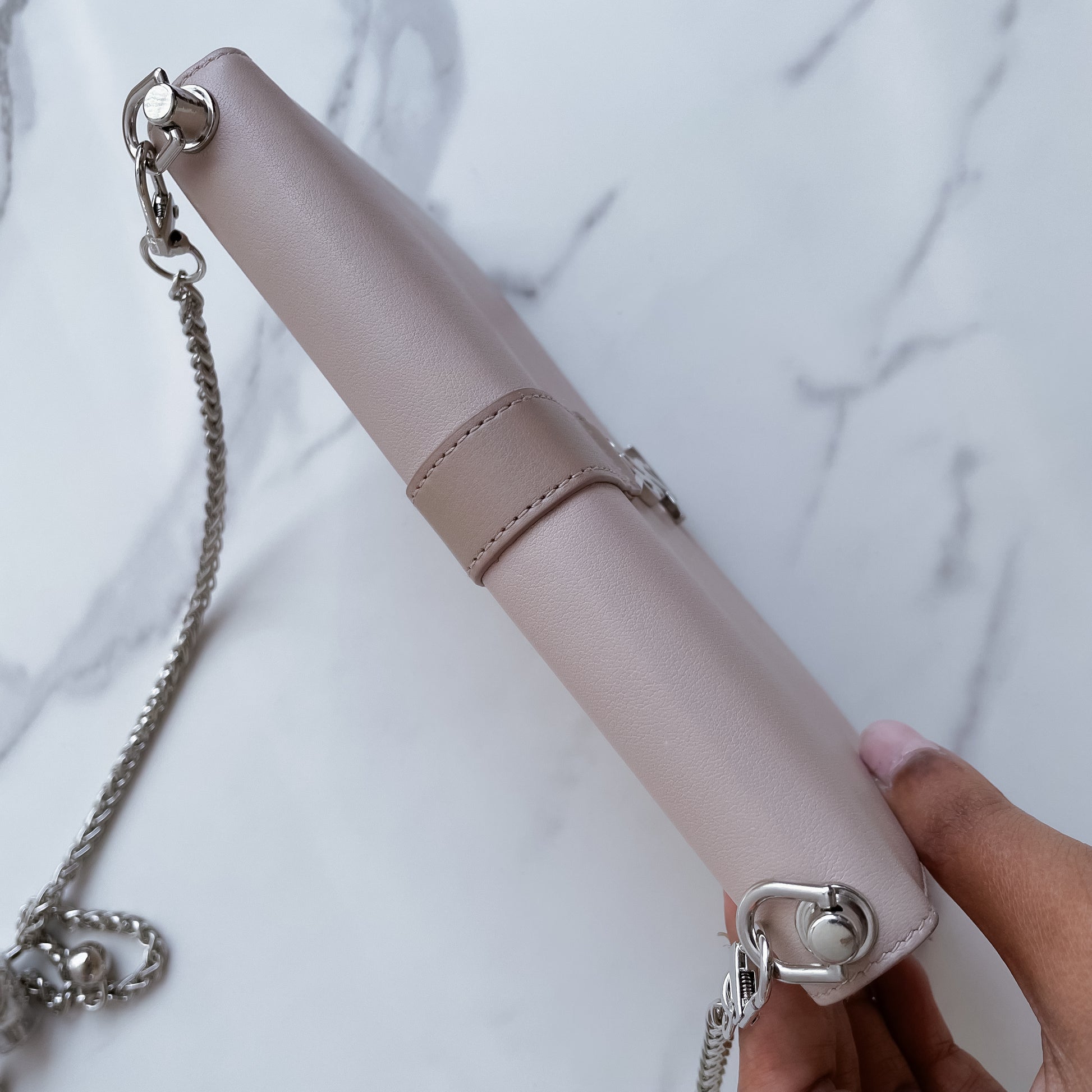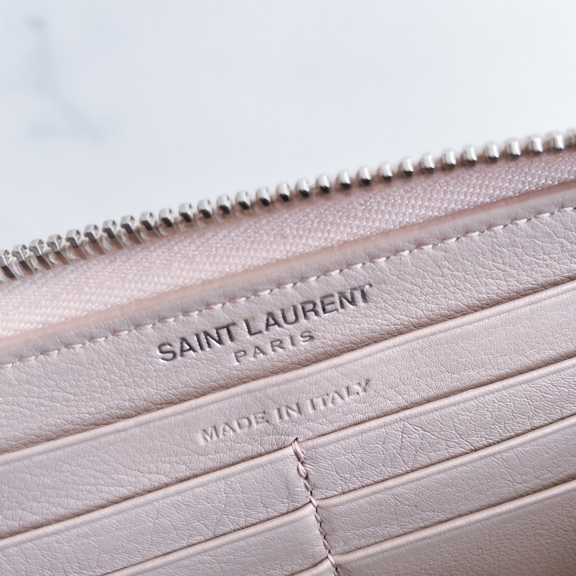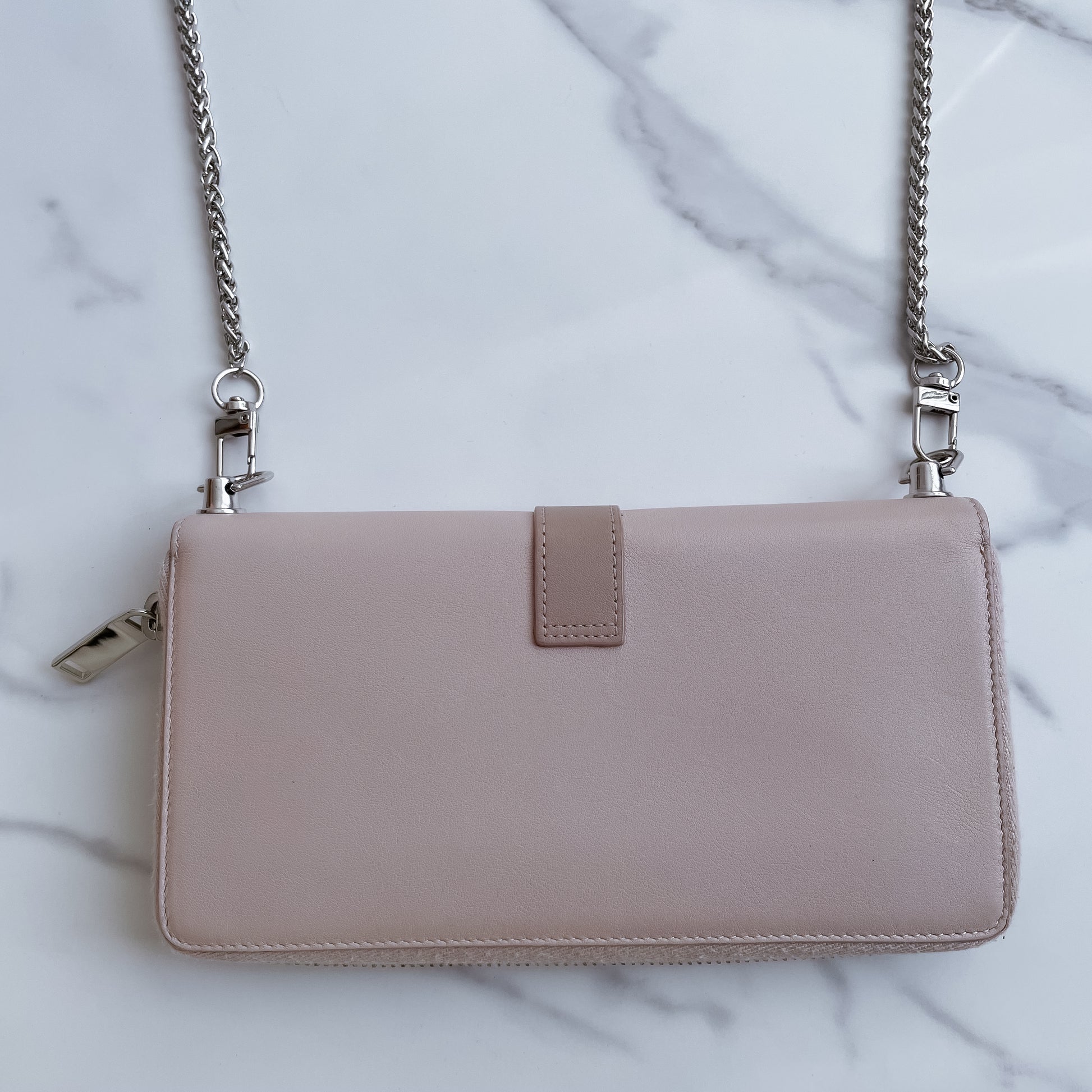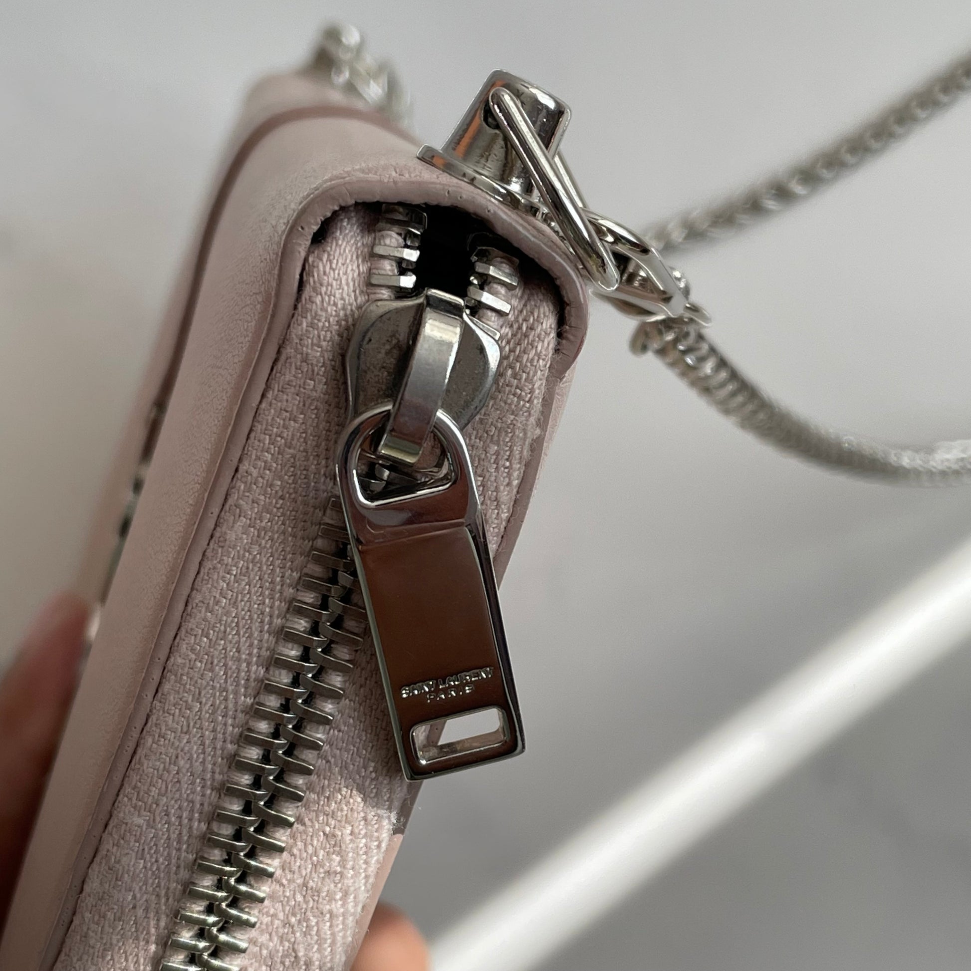 Authentic Preloved YSL wallet reworked into a crossbody with D-rings and generic adjustable removable silver tone chain. Also wearable as a short shoulder bag (see model pic)